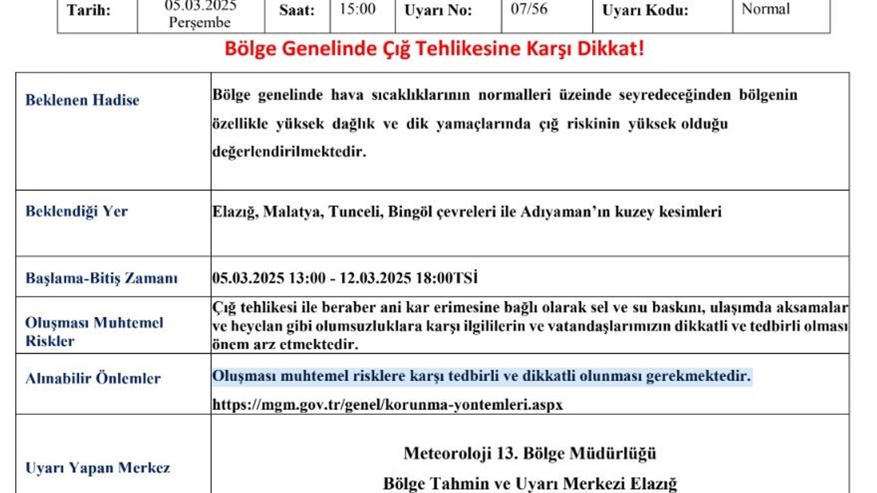 Meteoroloji 13. Bölge Müdürlüğü, Elazığ, Malatya, Adıyaman, Bingöl ve Tunceli için çığ uyarısında bulundu.
