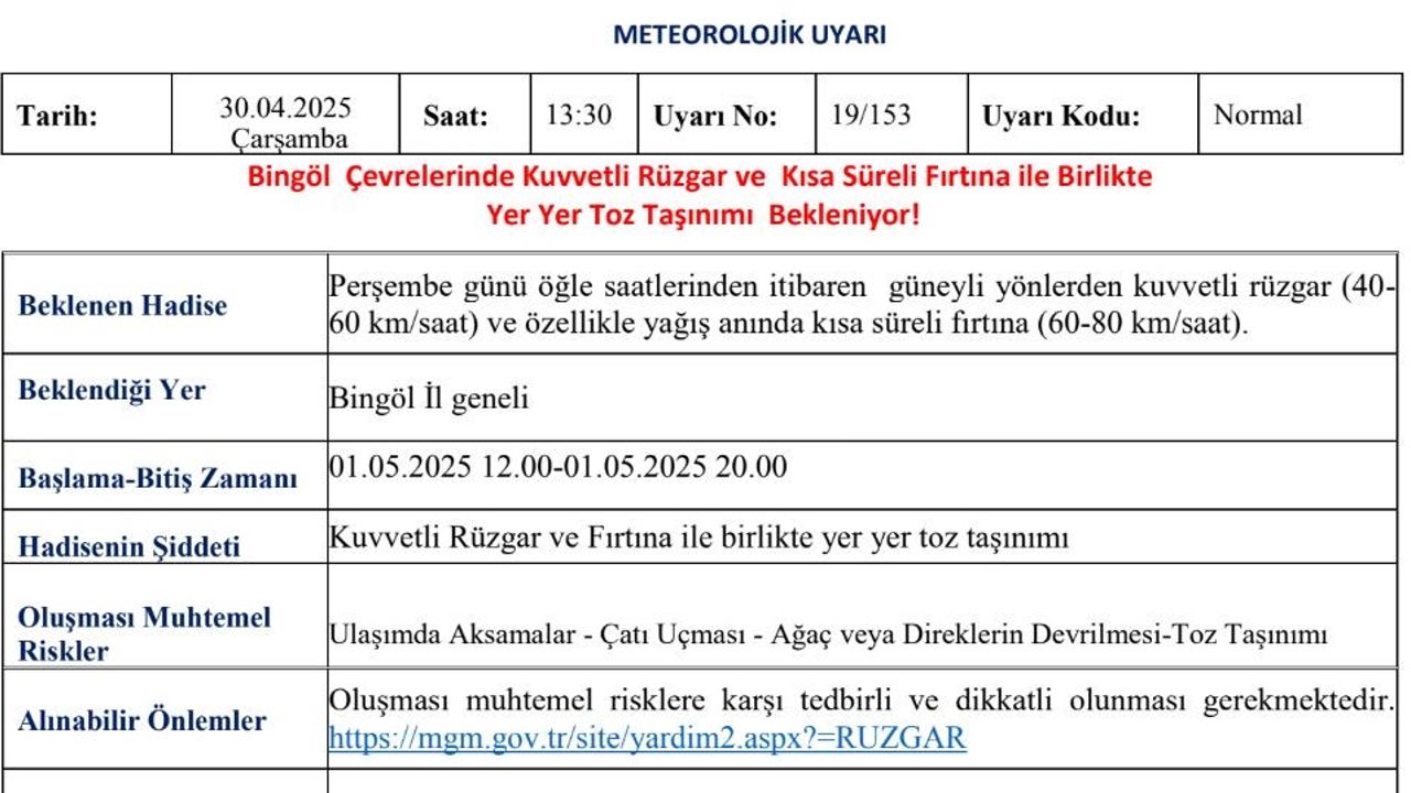 Meteoroloji 13. Bölge Müdürlüğü, Bingöl için kuvvetli rüzgar ve fırtına ile yer yer toz taşınımı uyarısı yaptı.