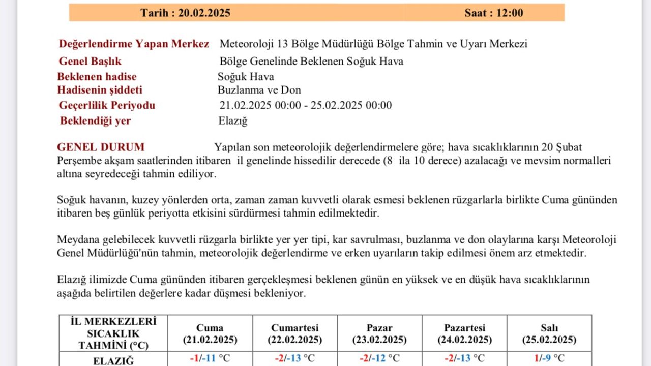 Meteoroloji 13. Bölge Müdürlüğü’nden yapılan açıklamada, "Yapılan son meteorolojik değerlendirmelere göre; hava sıcaklıklarının 20 Şubat Perşembe akşam saatlerinden itibaren il genelinde hissedilir derecede (8 ila 10 derece) azalacağı ve mevsim normalleri Soğuk havanın, kuzey yönlerden orta, zaman zaman kuvvetli olarak esmesi beklenen rüzgarlarla birlikte cuma gününden itibaren beş günlük periyotta etkisini sürdürmesi tahmin edilmektedir. Meydana gelebilecek kuvvetli rüzgarla birlikte yer yer tipi, kar savrulması, buzlanma ve don olaylarına karşı Meteoroloji Genel Müdürlüğü’nün tahmin, meteorolojik değerlendirme ve erken uyarıların takip edilmesi önem arz etmektedir. Ulaşımda aksamalar, buzlanma ve don olayı, kuvvetli rüzgarla birlikte yer yer tipi ve kar savrulması, dik ve eğimli yamaçlarda çığ tehlikesi gibi olaylara karşı dikkatli ve tedbirli olunmalıdır. Meteoroloji Genel Müdürlüğü tarafından gerek görüldükçe hazırlanacak olan anlık meteorolojik uyarıların takibini yaparak, oluşması muhtemel risklere karşı can ve mal emniyeti açısından dikkatli ve tedbirli olunması önem arz etmektedir" denildi.