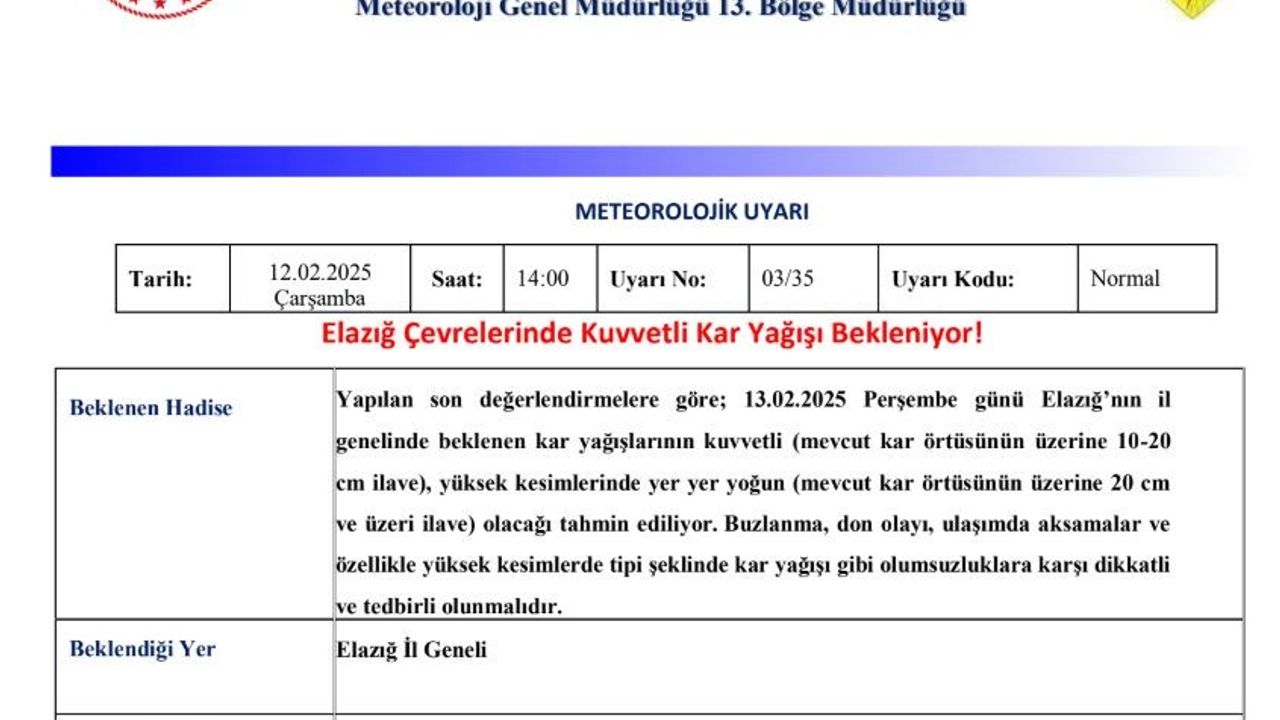 Meteoroloji 13. Bölge Müdürlüğü’nden yapılan açıklamada, "Yapılan son değerlendirmelere göre; 13.02.2025 Perşembe günü Elazığ’ın il genelinde beklenen kar yağışlarının kuvvetli (mevcut kar örtüsünün üzerine 10-20 cm ilave), yüksek kesimlerinde yer yer yoğun (mevcut kar örtüsünün üzerine 20 cm ve üzeri ilave) olacağı tahmin ediliyor. Buzlanma, don olayı, ulaşımda aksamalar ve özellikle yüksek kesimlerde tipi şeklinde kar yağışı gibi olumsuzluklara karşı dikkatli ve tedbirli olunmalıdır. Buzlanma ve don olayına bağlı ulaşımda aksamalar ve tipi gibi olumsuzluklara karşı dikkatli ve tedbirli olunması gerekmektedir. Oluşması muhtemel risklere karşı tedbirli ve dikkatli olunması gerekmektedir" denildi.