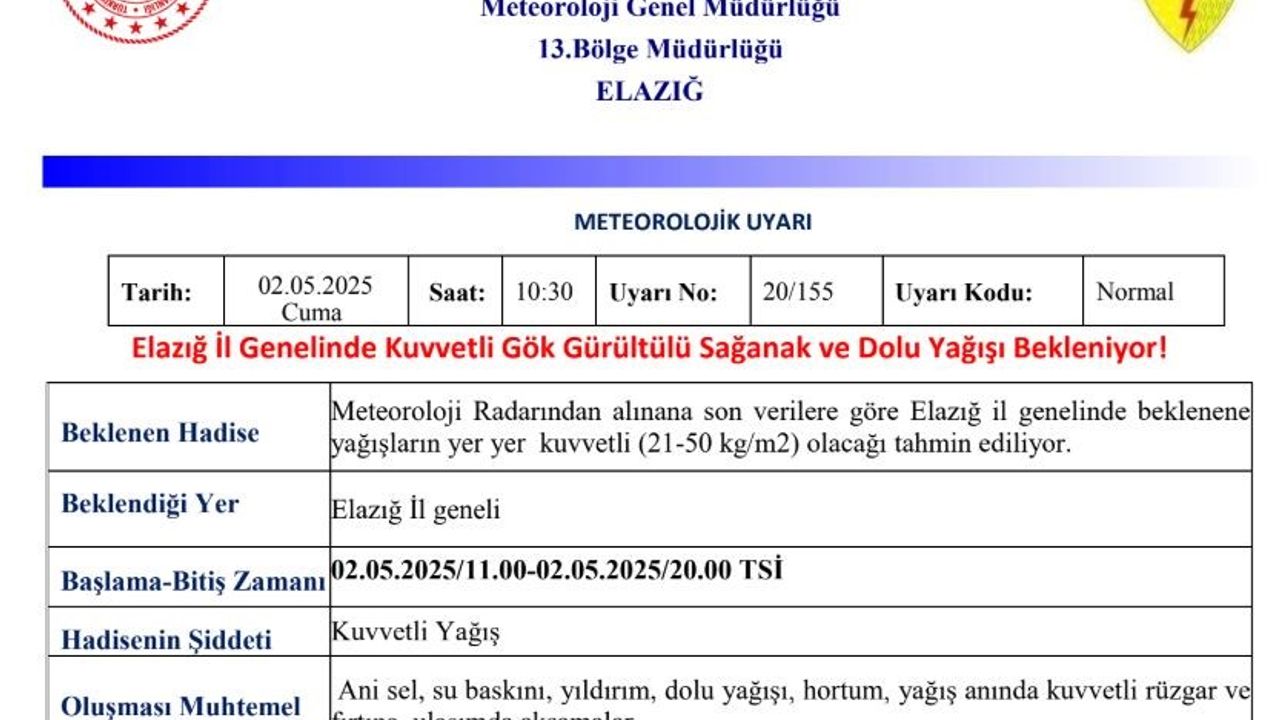 Meteoroloji 13. Bölge Müdürlüğü’nden yapılan açıklamada, "Meteoroloji Radarından alınana son verilere göre Elazığ il genelinde beklenene yağışların yer yer kuvvetli (21-50 kg/m2) olacağı tahmin ediliyor. Ani sel, su baskını, yıldırım, dolu yağışı, hortum, yağış anında kuvvetli rüzgar ve fırtına, ulaşımda aksamalara karşı tedbirli ve dikkatli olunması gerekmektedir" denildi.