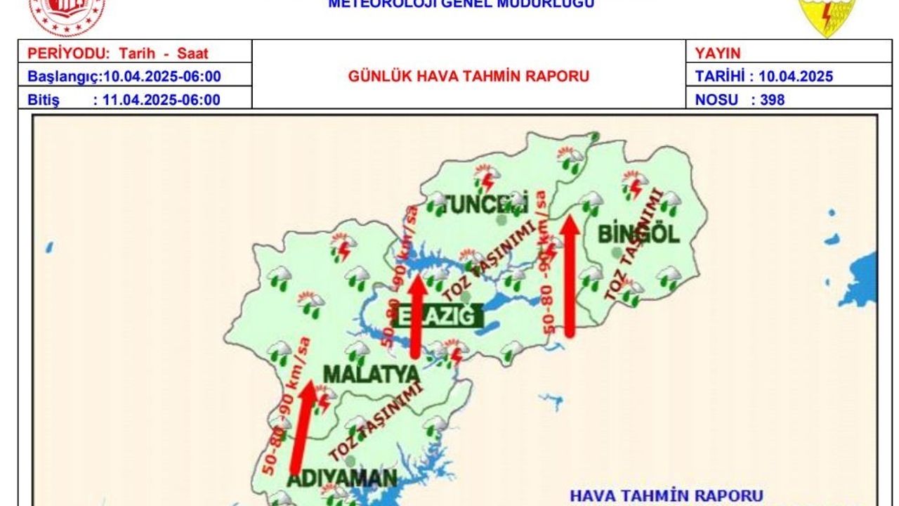 Meteoroloji 13. Bölge Müdürlüğü Elazığ, Malatya, Bingöl, Adıyaman ve Tunceli için rüzgar, toz taşınımı ve dolu uyarısında bulundu.