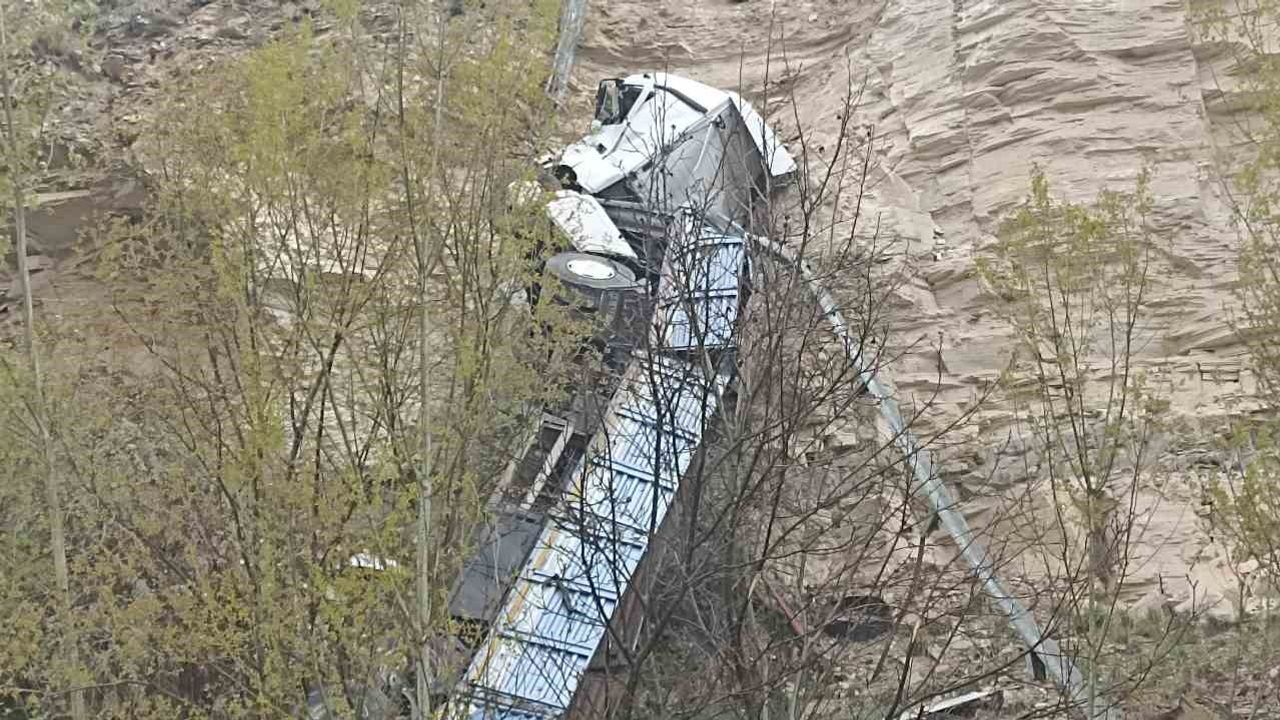 Sivas’ta metrelerce yükseklikten uçuruma düşen tırın sürücüsü kazayı hafif sıyrıklarla atlattı.