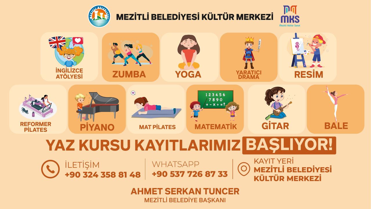 Kayıtlar Mezitli Belediyesi Kültür Merkezi’nde alınmaya başlandı. Detaylı bilgi ve başvuru için 0324 358 81 48 numaralı telefon ya da 0537 726 87 33 numaralı WhatsApp hattı üzerinden iletişime geçilebilir.