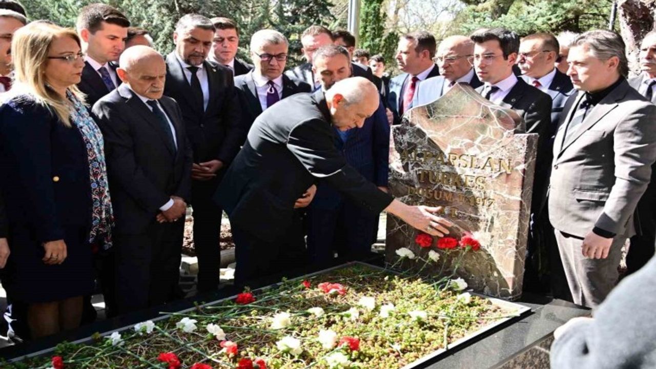 MHP Genel Başkanı Bahçeli, Kur’an-ı Kerim tilaveti ve duaların ardından Türkeş’in kabrine kırmızı beyaz karanfiller bıraktı, bakır ibrikle su döktü. Ziyarette parti yetkilileri ile Ülkü Ocakları Genel Başkanı Ahmet Yiğit Yıldırım da yer aldı.