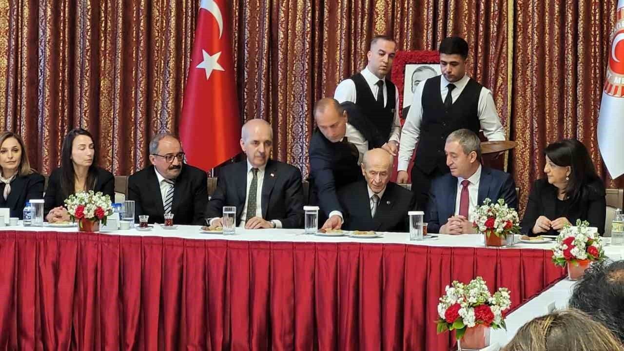 Kurtulmuş’un ardından salona gelen MHP Lideri Bahçeli’yi DEM Parti heyeti kapıda karşıladı. Salon girişinde bulunan Önder’in fotoğrafına dokunan Bahçeli, DEM Parti heyeti ve Önder’in kardeşi ile sohbet etti. 99 gün sonra ilk kez bir programa katılan Bahçeli, törende 15 dakika kaldı.