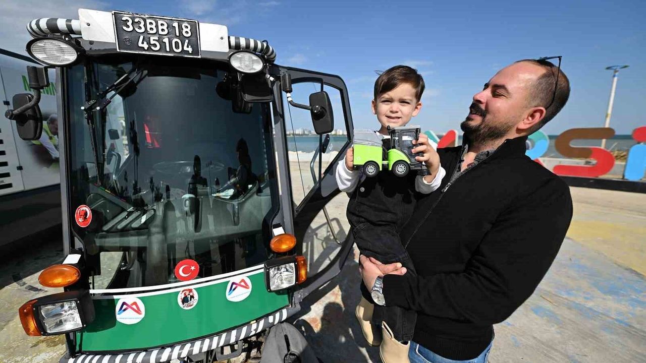 Belediyeye davet edilen Ayaz, büyük ilgi duyduğu yeşil süpürge kamyonuna binme fırsatı buldu. Kent temizliği için görev yapan aracı yakından inceleyen minik Ayaz'ın mutluluğu yüzüne yansıdı. Ekipler ayrıca Ayaz'a oyuncak yeşil süpürge arabası, boyama kitapları ve su matarası hediye ederek sevincini artırdı.