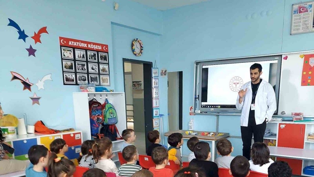 DÜZCE(İHA) – Akçakoca İlçe Sağlık Müdürlüğü tarafından minik öğrenciler sağlık taramasından geçti sağlıklı beslenme anlatıldı.