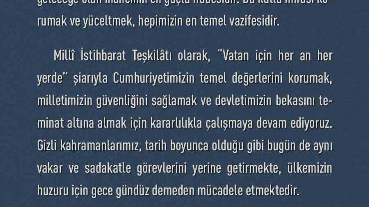 MİT Başkanı Kalın, 29 Ekim Cumhuriyet Bayramı dolayısıyla tebrik mesajı yayımladı. Kalın, mesajında şu ifadelere yer verdi: "Cumhuriyetimizin kuruluşunun 102. yıl dönümünü milletçe büyük bir gurur ve coşkuyla idrak ediyoruz. Cumhuriyet, aziz milletimizin bağımsızlık iradesinin ve ortak geleceğe olan inancının en güçlü ifadesidir. Bu kutlu mirası korumak ve yüceltmek, hepimizin en temel vazifesidir. Milli İstihbarat Teşkilatı olarak ‘Vatan için her an her yerde’ şiarıyla Cumhuriyetimizin temel değerlerini korumak, milletimizin güvenliğini sağlamak ve devletimizin bekasını teminat altına almak için kararlılıkla çalışmaya devam ediyoruz. Gizli kahramanlarımız, tarih boyunca olduğu gibi bugün de aynı vakar ve sadakatle görevlerini yerine getirmekte, ülkemizin huzuru için gece gündüz demeden mücadele etmektedir. Bu anlamlı günde başta Cumhuriyetimizin banisi Gazi Mustafa Kemal Atatürk ve silah arkadaşları olmak üzere tüm şehit ve gazilerimizi rahmet ve minnetle anıyor, aziz milletimizin Cumhuriyet Bayramı’nı en içten dileklerimle kutluyorum."