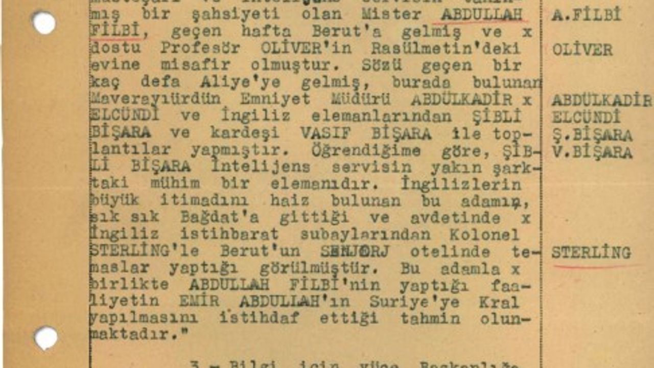 "Maverayıürdün’deki İngiliz müsteşarı ve İntelijans Servisi’nin tanınmış bir şahsiyeti olan Mister Abdullah Filbi geçen hafta Beyrut’a gelmiş ve dostu Profesör Oliver’in Rasülmetin’deki evine misafir olmuştur. Sözü geçen birkaç defa Aliye’ye gelmiş, burada bulunan Maverayıürdün Emniyet Müdür Abdülkadir El-Cündi ve İngiliz elemanlarından Şibli Bişara ve kardeşi Vasıf Bişara ile toplantılar yapmıştır. Öğrendiğime göre Şibli Bişara İntelijans Servisi yakın şarktaki mühim bir elemanıdır. İngilizlerin büyük itimadını haiz bulunan bu adamın sık sık Bağdat’a gittiği ve avdetinde İngiliz istihbarat subaylarından Kolonel Sterling ile Beyrut’un Senjorj Oteli’nde temaslar yaptığı görülmüştür. Bu adamla birlikte Abdullah Filbi’nin yaptığı faaliyetin Emir Abdullah’ın Suriye’ye Kral yapılmasını istihdaf ettiği tahmin olunmaktadır."