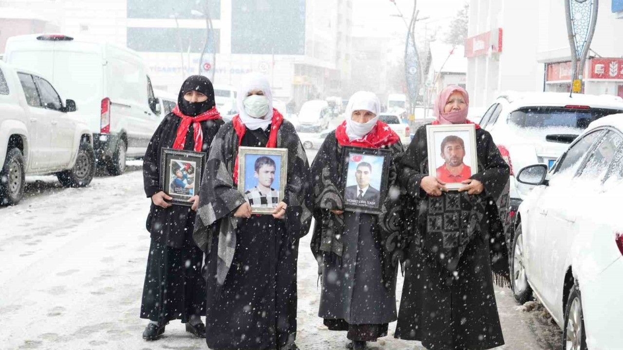 Muş’ta çocukları terör örgütü PKK tarafından kaçırılan aileler, DEM Parti İl Başkanlığı önündeki eylemlerini kar yağışı altında sürdürüyor.