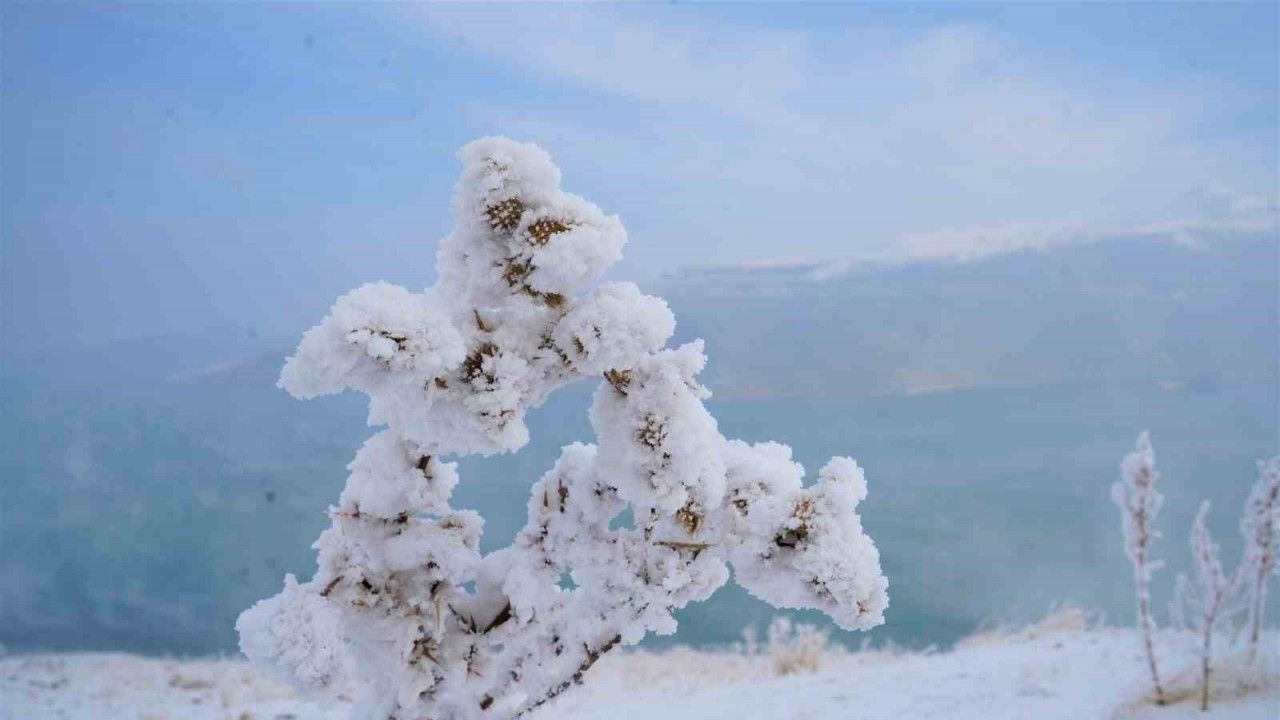 Muş’ta etkili olan soğuk hava nedeniyle kırağı tutan otlar pamuk tarlasını andırdı.