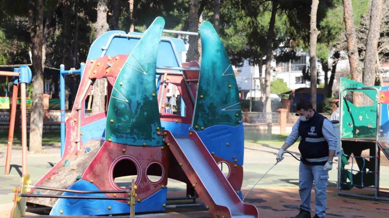 Nazilli Belediyesi, çocukların sağlıklı bir ortamda vakit geçirebilmesi için başlattığı oyun parklarındaki dezenfeksiyon çalışmalarına devam ediyor.