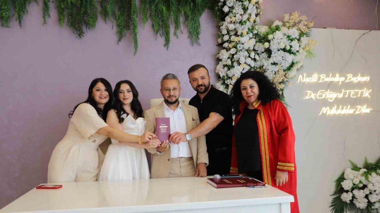 Evlilik tarihini unutulmaz hale getirmek isteyen ve ’05.05.2025’ tarihini tercih eden çiftler, nikah salonlarında yoğunluk oluşturdu. Yoğunluğun oluştuğu yerlerden birisi de Aydın’ın Nazilli ilçesi oldu. Sabahın erken saatlerinden itibaren nikah salonlarına gelen çiftlerin nikahları kıyılırken, evlendirme memurları da tam mesai yaptı. Bu kapsamda Nazilli Belediyesi Evlendirme Memurluğu’nda, 5 Mayıs 2025 Pazartesi günü adeta bir nikah maratonu yaşandı. Sabah saat 10.00’dan akşam 17.30’a kadar her yarım saatte bir çiftin nikahını kıyan ekipler, toplamda 12 çifti dünya evine uğurlarken 10 çiftin nikahı için de ayrıca kayıt aldı. Zafer Mahallesi’nde bulunan Şehit Mustafa Akdağ Parkı içerisindeki Nazilli Belediyesi Evlendirme Dairesi’nde gerçekleşen törenlerde, belediye evlendirme memurları yoğun ama keyifli bir gün geçirdi.