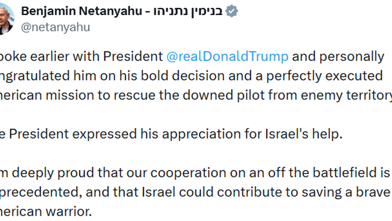 İsrail Başbakanı Binyamin Netanyahu, sosyal medya hesabından yaptığı açıklamada ABD Başkanı Donald Trump ile telefonda görüştüğünü duyurdu. Görüşmenin içeriğine değinen Netanyahu, 'İran'da düşen uçağın pilotunu düşman topraklarından kurtarma konusunda aldığı cesur karar ve kusursuz bir şekilde yürütülen Amerikan operasyonu nedeniyle kendisini şahsen tebrik ettim' ifadelerini kullandı. Trump'ın da İsrail'in bu operasyona verdiği destek konusundaki minnettarlığını kendisine ilettiğini kaydeden Netanyahu, 'Savaş alanında ve dışında kurduğumuz işbirliğinin eşi benzeri görülmemiş bir düzeyde olmasından ve İsrail'in cesur bir Amerikan savaşçısının kurtarılmasına katkıda bulunabilmesinden büyük gurur duyuyorum' dedi.