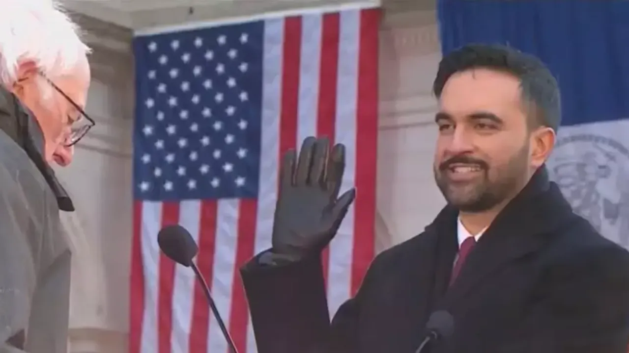 Halk önündeki yemin töreni için sahneye çıkan Demokrat Senatör Bernie Sanders, yemin metnini Mamdani'ye tekrarlattı. Yeni belediye başkanı yemin etmek için elini büyükannesinin Kur'an-ı Kerim'ine koyarken kalabalık 'Zohran, Zohran, Zohran' diye tezahürat yaptı. Yemin töreni esnasında gelenek üzere Mamdani'nin eşi Rama Duwaji yanında yer aldı. Sanders'ın Mamdani'ye destek konuşması esnasında, 'Zenginlerin ve şirketlerin vergi yükümlülüklerinin adil payını ödemeye başlamalarını talep etmek radikal bir şey değil. Bu tam olarak yapılması gereken doğru şey' dediği sırada kalabalık sık sık 'Zenginleri vergilendirin' sloganları attı.