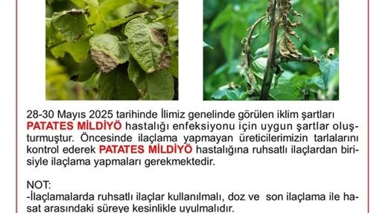 Daha önce ilaçlama yapmamış olan çiftçilerin acilen tarlalarını kontrol ederek ruhsatlı ilaçlarla müdahale etmeleri gerektiğinin hatırlatıldığı uyarıda üreticilerin verim kaybı yaşamamaları için ilaçlama önerisinde bulunuldu. Yapılan açıklamada, mildiyö hastalığının, patates yapraklarında solma, kararma ve kuruma gibi ciddi zararlara yol açabileceğine dikkat çekilerek, hastalıkla mücadelede doğru zamanlama ve uygun ilaç kullanımının hayati önem taşıdığı belirtildi.