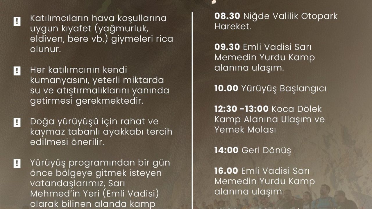 Öğle molasının Koca Dölek Kamp Alanı’nda verileceği etkinlik, 14.00’te dönüş yolculuğuyla devam edecek. Saat 18.00’de Niğde’ye varılmasıyla sona erecek doğa yürüyüşüne katılmak isteyen vatandaşların, uygun kıyafet ve gerekli ekipmanları yanlarında bulundurmaları gerektiği belirtildi. Ayrıca etkinliğe toplu taşıma imkânı sağlanacağı, 0388 232 34 21 iletişim numarası üzerinden kayıt yaptırılabileceği ifade edildi.
