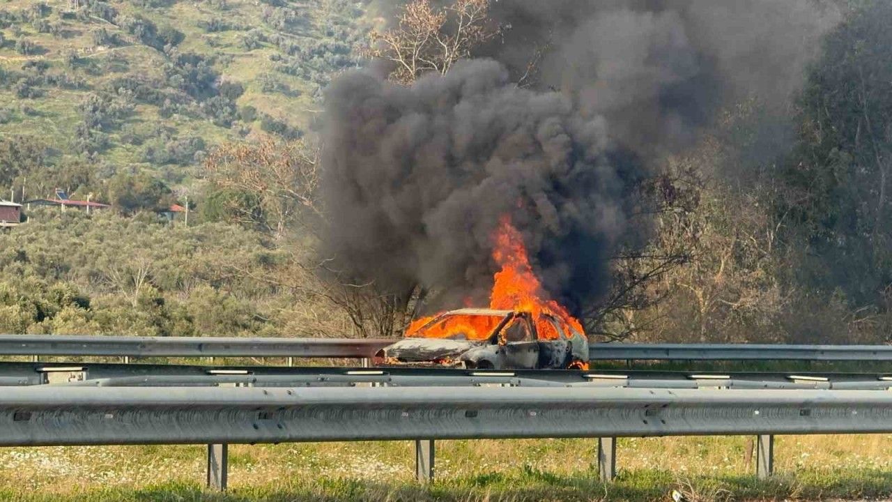 Aydın’ın Germencik ilçesinde seyir halindeyken alevlere teslim olan otomobil hurdaya döndü.