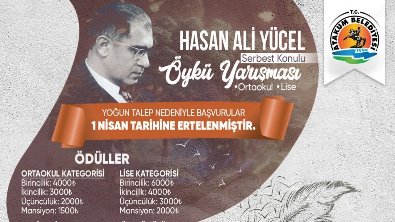 Atakum Belediyesi, bu yıl ilkini düzenleyeceği Hasan Ali Yücel Öykü Yarışmasına başvuru süresini yoğun talep üzerine 1 Nisan Salı günü kadar uzattı.