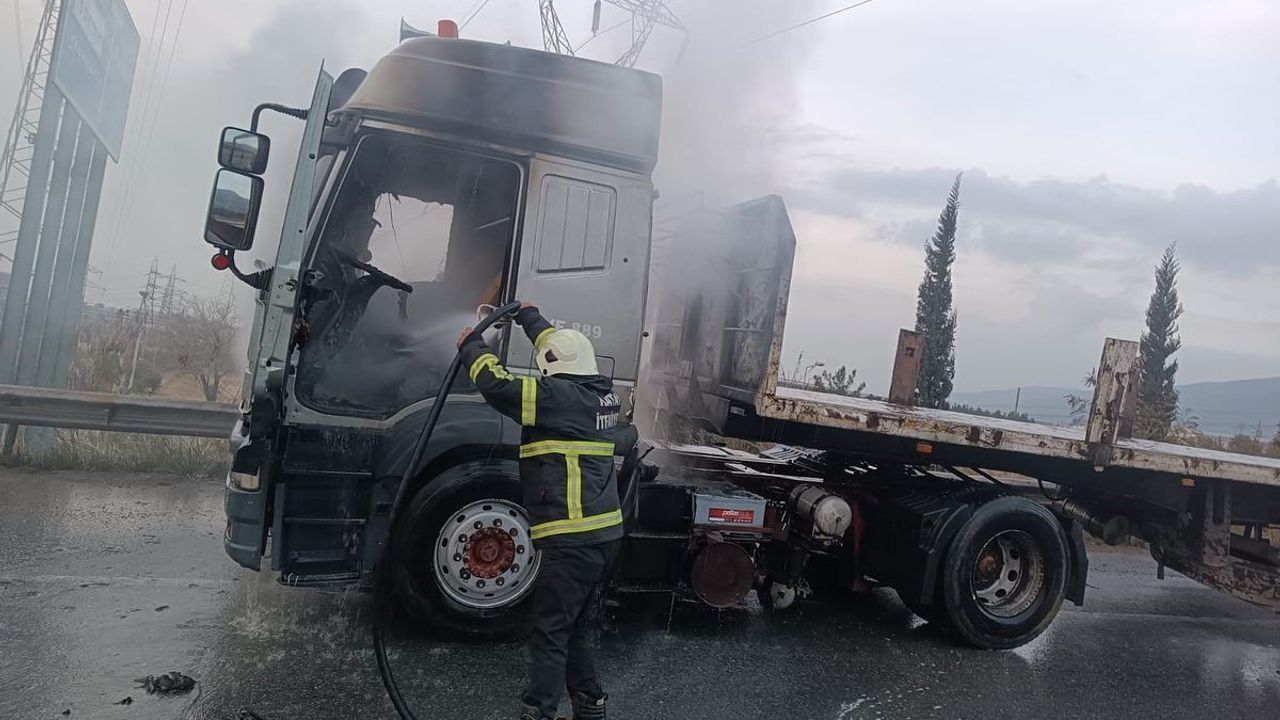 Hatay’da seyir halindeyken alevlere teslim olan tırda çıkan yangını itfaiye söndürdü.