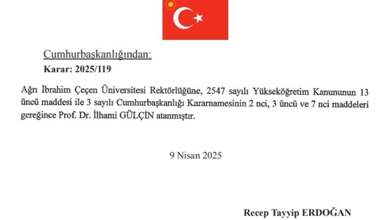 Cumhurbaşkanı Recep Tayyip Erdoğan’ın imzasıyla Resmî Gazete’de yayımlanan atama kararıyla, Prof. Dr. İlhami Gülçin, Ağrı İbrahim Çeçen Üniversitesi Rektörlüğüne getirildi. Prof. Dr. Gülçin, görevi iki dönemdir sürdüren Prof. Dr. Abdulhalik Karabulut’un yerine devraldı. Akademik çalışmalarıyla bilim dünyasında adından sıkça söz ettiren Gülçin, biyokimya alanındaki uluslararası başarılarıyla tanınıyor.