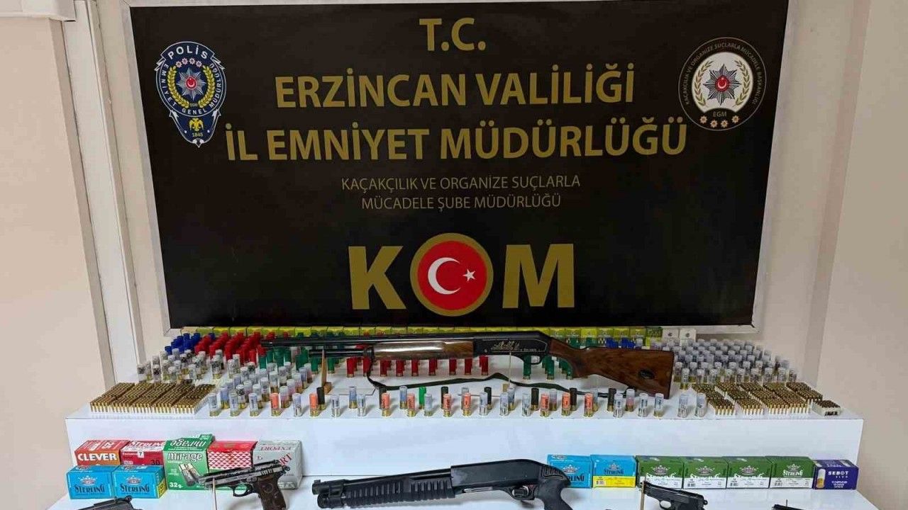 "İl Emniyet Müdürlüğümüz Kaçakçılık ve Organize Suçlarla Mücadele Şube Müdürlüğü ve Refahiye İlçe Emniyet Müdürlüğü ekiplerince, Refahiye ilçesinde 6136 SKM suçunun önlenmesi, faillerin tespiti, şüphelilerin yakalanması ve suç unsurlarının ele geçirilmesi amacı ile yapılan teknik ve fiziki takip çalışmalarının sonucunda N.T, N.K. ve D.Y. isimli şahıslara ait toplam 7 adreste yapılan aramada; 4 adet tabanca ve tabancalara ait 5 adet şarjör, 2 adet pompalı tüfek, 322 adet kartuş, farklı marka ve ebatlarda toplamda 794 adet fişek ele geçirilerek el konulmuştur.
