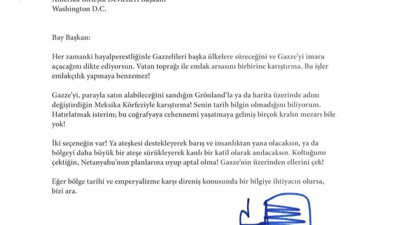 "Bay Başkan: Her zamanki hayalperestliğinle Gazzelileri başka ülkelere süreceğini ve Gazze’yi imara açacağını dikte ediyorsun. Vatan toprağı ile emlak arsasını birbirine karıştırma. Bu işler emlakçılık yapmaya benzemez. Gazze’yi, parayla satın alabileceğini sandığın Grönland’la ya da harita üzerinde adını değiştirdiğin Meksika Körfeziyle karıştırma. Senin tarih bilgin olmadığını biliyorum. Hatırlatmak isterim; bu coğrafyaya cehennemi yaşatmaya gelmiş birçok kralın mezarı bile yok. İki seçeneğin var. Ya ateşkesi destekleyerek barış ve insanlıktan yana olacaksın, ya da bölgeyi daha büyük bir ateşe sürükleyerek kanlı bir katil olarak anılacaksın. Koltuğunu çektiğin, Netanyahu’nun planlarına uyup aptal olma. Gazze’nin üzerinden ellerini çek! Eğer bölge tarihi ve emperyalizme karşı direniş konusunda bir bilgiye ihtiyacın olursa bizi ara."