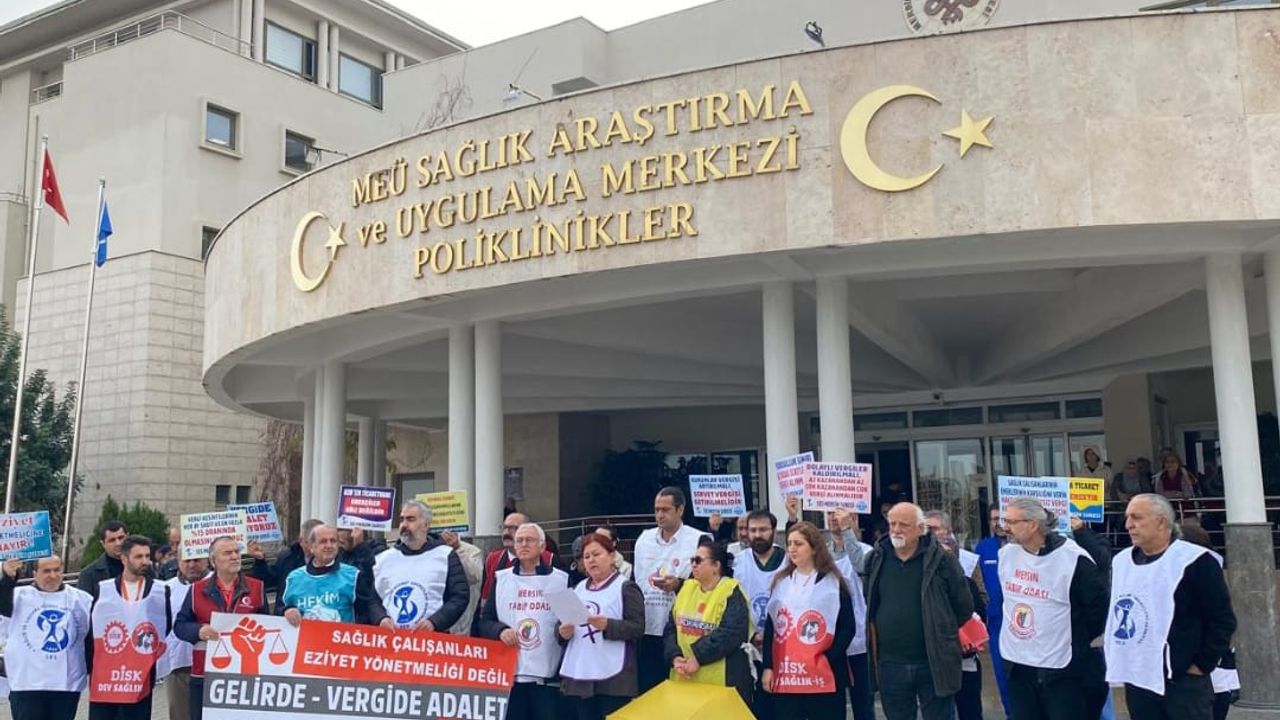 Mersin Sağlık Örgütleri Platformu üyeleri, Mersin Üniversitesi Tıp Fakültesi Hastanesi poliklinik girişi önünde toplanarak vergide ve gelirde adalet talebiyle bir basın açıklaması gerçekleştirdi. Açıklamayı platform adına KESK’e bağlı Sağlık ve Sosyal Hizmet Emekçileri Sendikası (SES) Mersin Şube Eş Başkanı