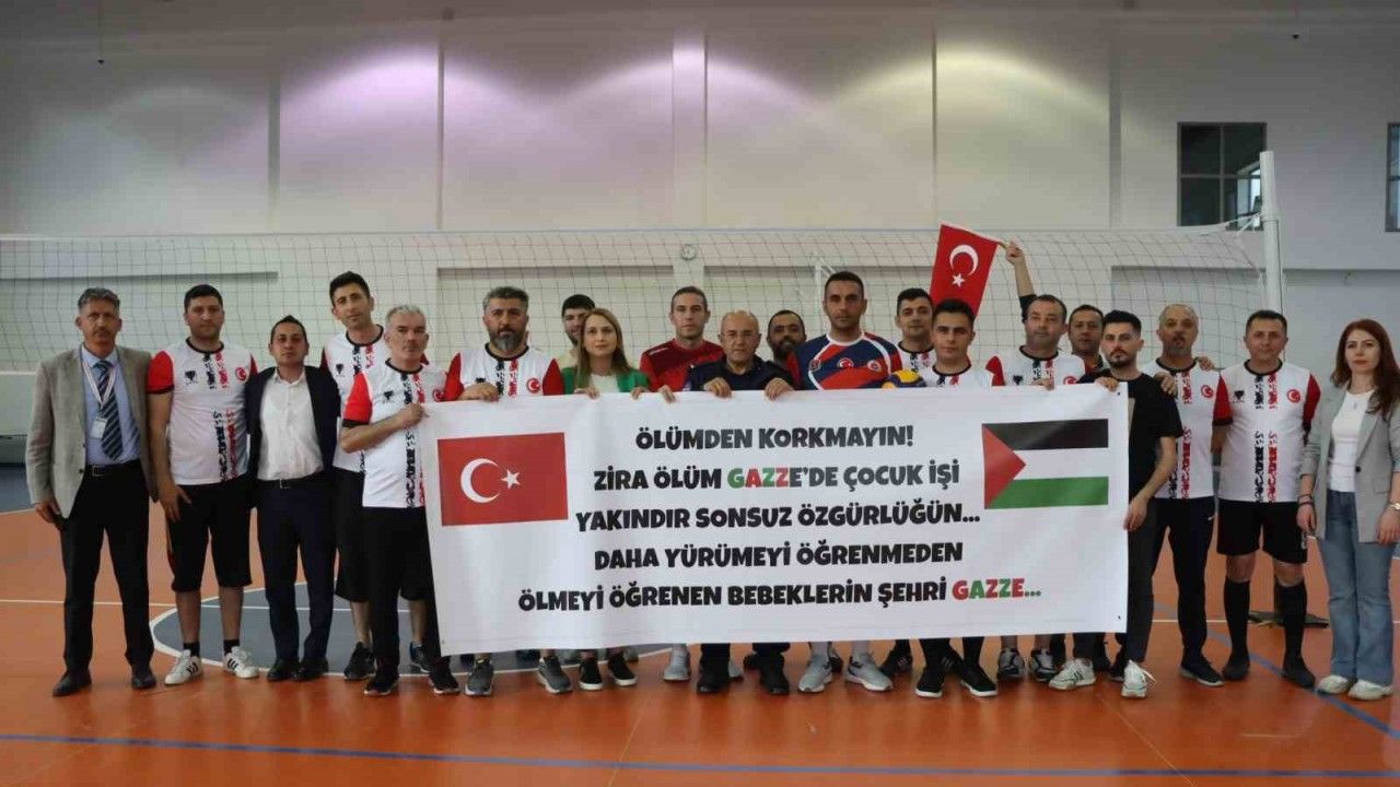 Kayseri’de sağlıkçılar arasında düzenlenen voleybol turnuvasında Filistinli çocukları anmak için hazırlanan pankart duygulandırdı.