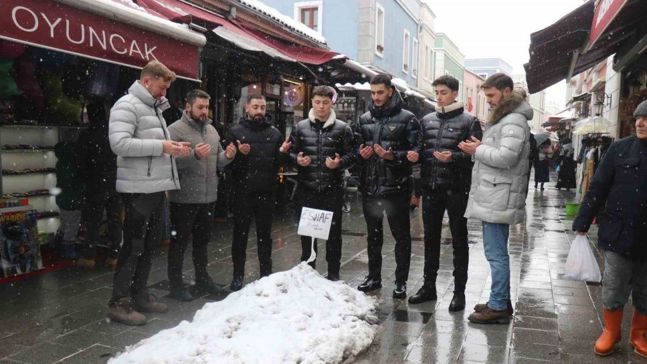 Sakarya’nın Adapazarı ilçesinde esnaf, kar yağışının ardından Tarihi Uzun Çarşı’nın ortasına kardan mezar yaparak başında dua etti.
