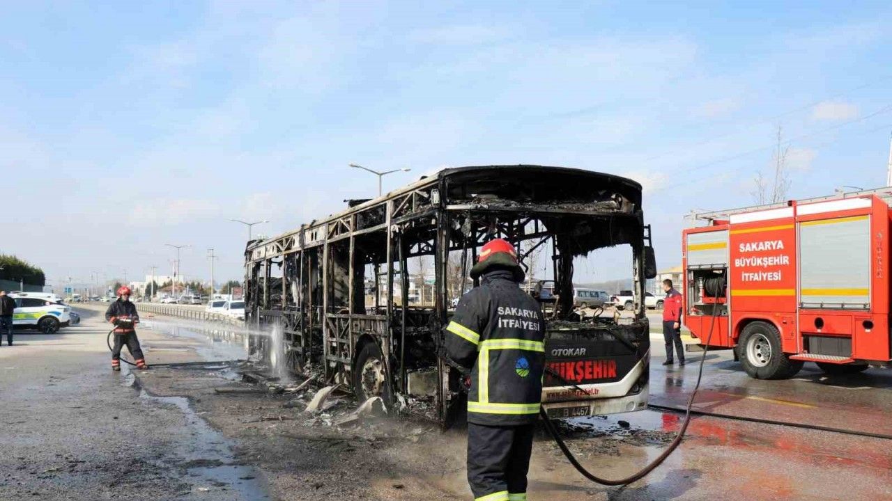 Sakarya’nın Adapazarı ilçesinde duble yolda belediye otobüsü alev topuna döndü. Aracın alev alev yandığı anlar cep telefonu kamerası ile saniye saniye kaydedildi. Yolcuların tahliye edildiği araçtan geriye demir yığını kaldı.