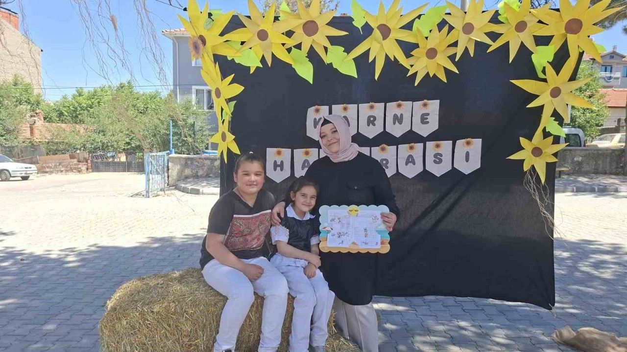 Okul bahçesinde hazırlanan karne hatırası panosu önüne hasat zamanı olması nedeniyle okul idaresi tarafından iki balya saman konuldu. Gülümseten saman balyalı karne hatırası panosu çocuklarıyla resim çektirmek isteyen velilerin akınına uğradı.