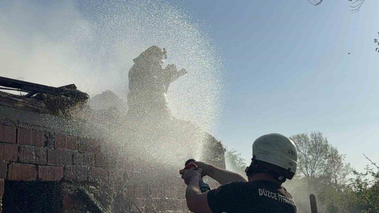 Düzce’de samanlıkta çıkan yangın itfaiye ekiplerinin çalışmaları ile söndürüldü. Bir itfaiye erinin saman balyalarının içine girmesi ise görüntülere yansıdı.