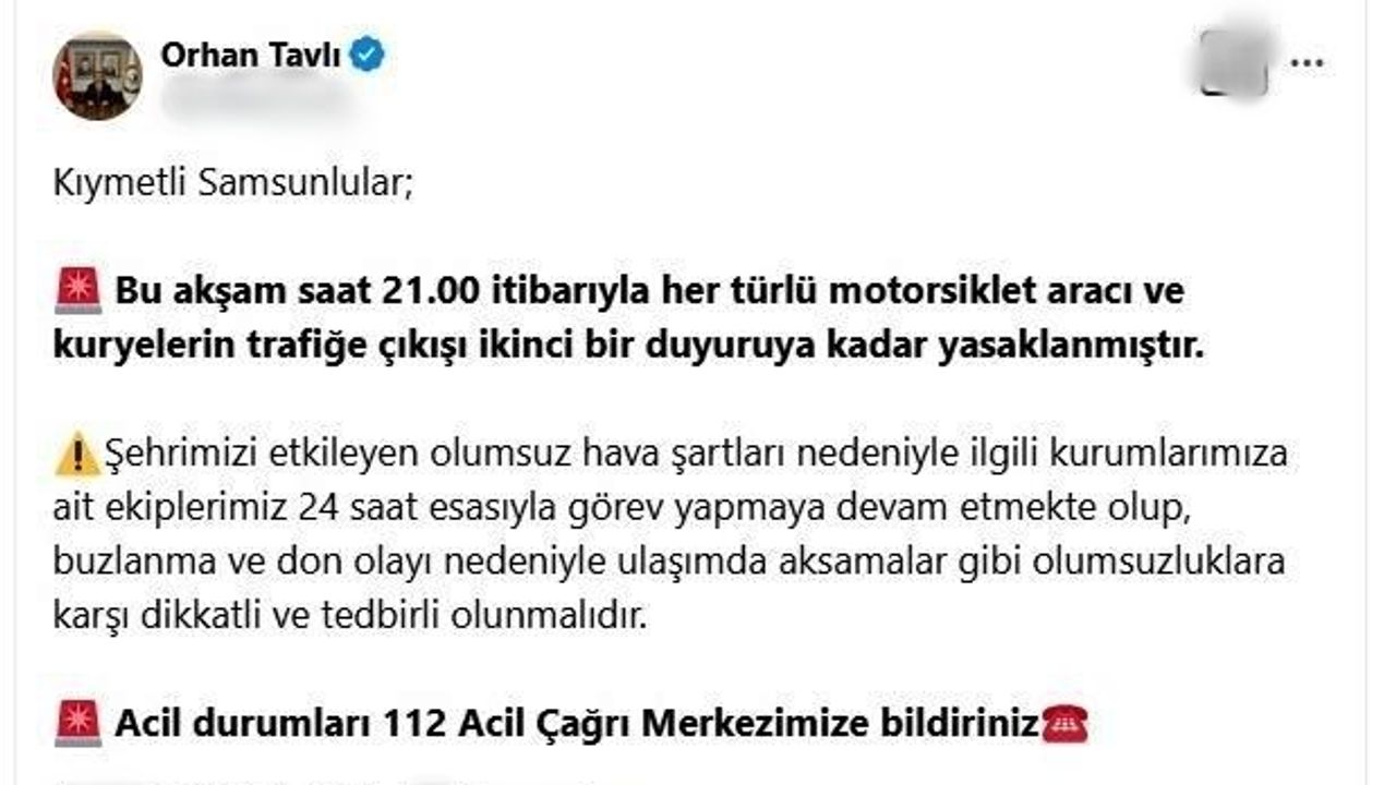 Vali Orhan Tavlı, olumsuz hava şartları nedeniyle alınan kararı sosyal medya hesabından açıkladı. Vali Tavlı, yasakla alakalı yaptığı yazılı açıklamada, "Kıymetli Samsunlular; bu akşam saat 21.00 itibarıyla her türlü motosiklet aracı ve kuryelerin trafiğe çıkışı ikinci bir duyuruya kadar yasaklanmıştır. Şehrimizi etkileyen olumsuz hava şartları nedeniyle ilgili kurumlarımıza ait ekiplerimiz 24 saat esasıyla görev yapmaya devam etmekte olup, buzlanma ve don olayı nedeniyle ulaşımda aksamalar gibi olumsuzluklara karşı dikkatli ve tedbirli olunmalıdır. Acil durumları 112 Acil Çağrı Merkezimize bildiriniz" dedi.