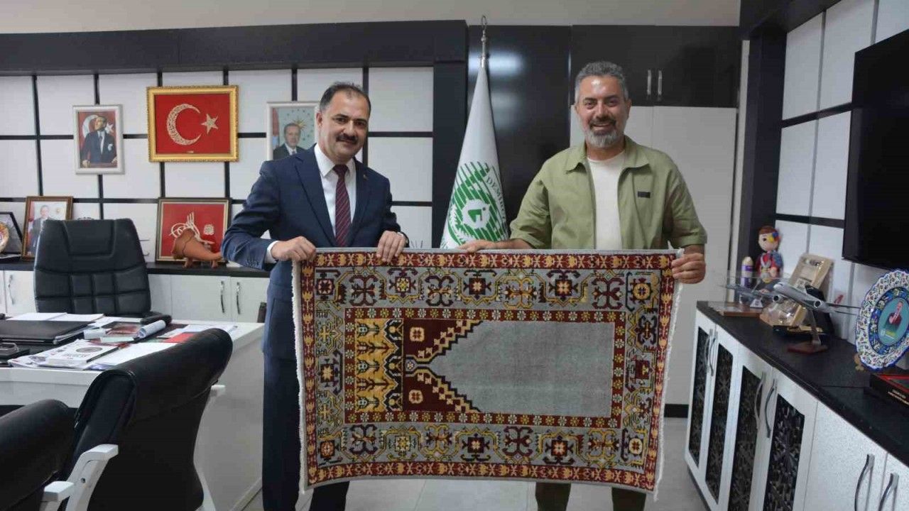 Başkan Erkan Kara ilçeyi ziyaretinden dolayı sanatçı Turgay Başyayla’ya teşekkür ederek halı hediye etti.