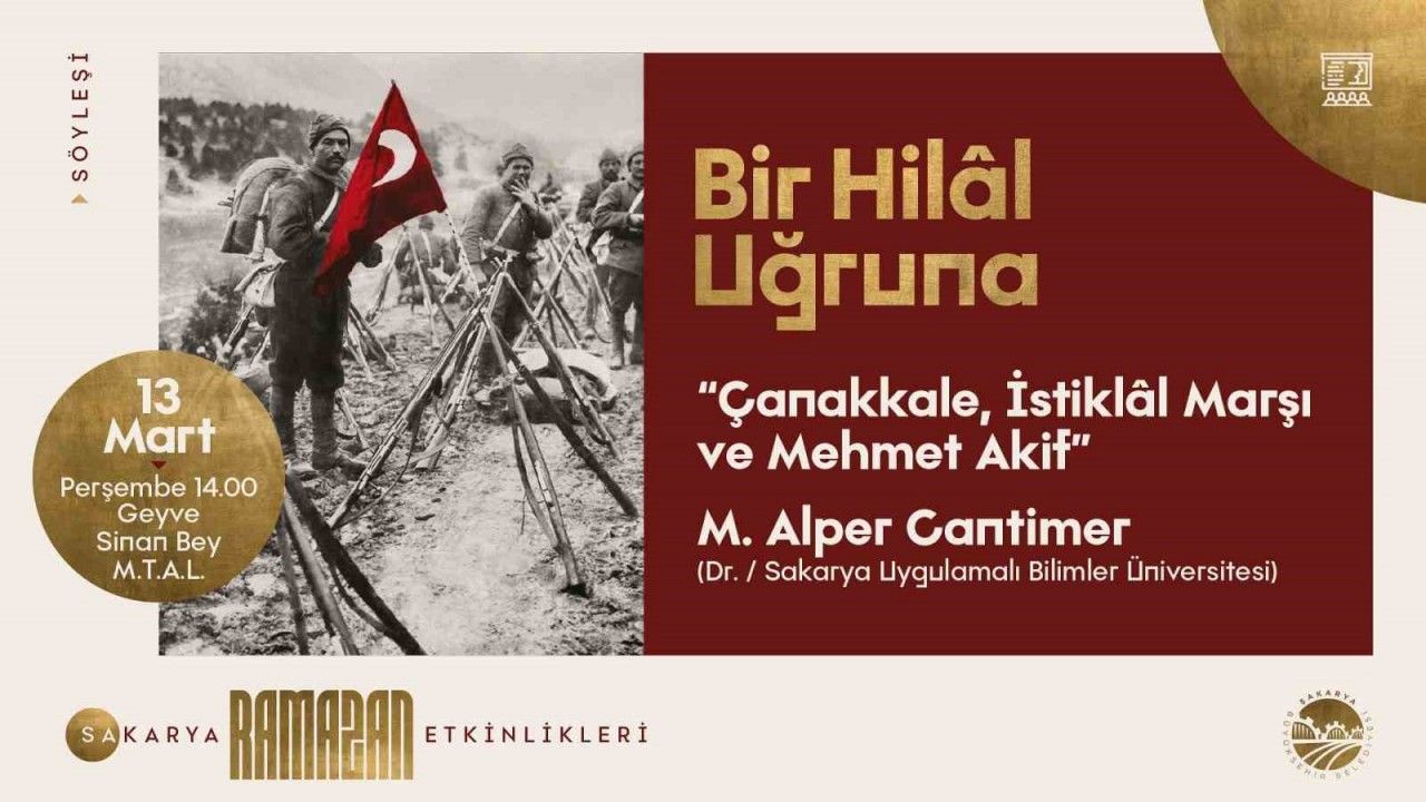 Sakarya Büyükşehir Belediyesi, Ramazan Kültür Takvimi ile mehteran gösterisinden söyleşilere uzanan etkinliklerle Ramazan’ın manevi atmosferini sanat ve kültürle taçlandırıyor. Takvim, 13 Mart Perşembe günü birbirinden güzel 3 farklı etkinlikle devam edecek. İlk program 13 Mart Perşembe günü saat 14.00’te, Geyve Sinan Bey Mesleki ve Teknik Anadolu Lisesi’nde, Dr. M. Alper Cantimer’in sunumuyla "Bir Hilal Uğruna: Çanakkale, İstiklal Marşı ve Mehmet Akif" konulu söyleşi olacak.
