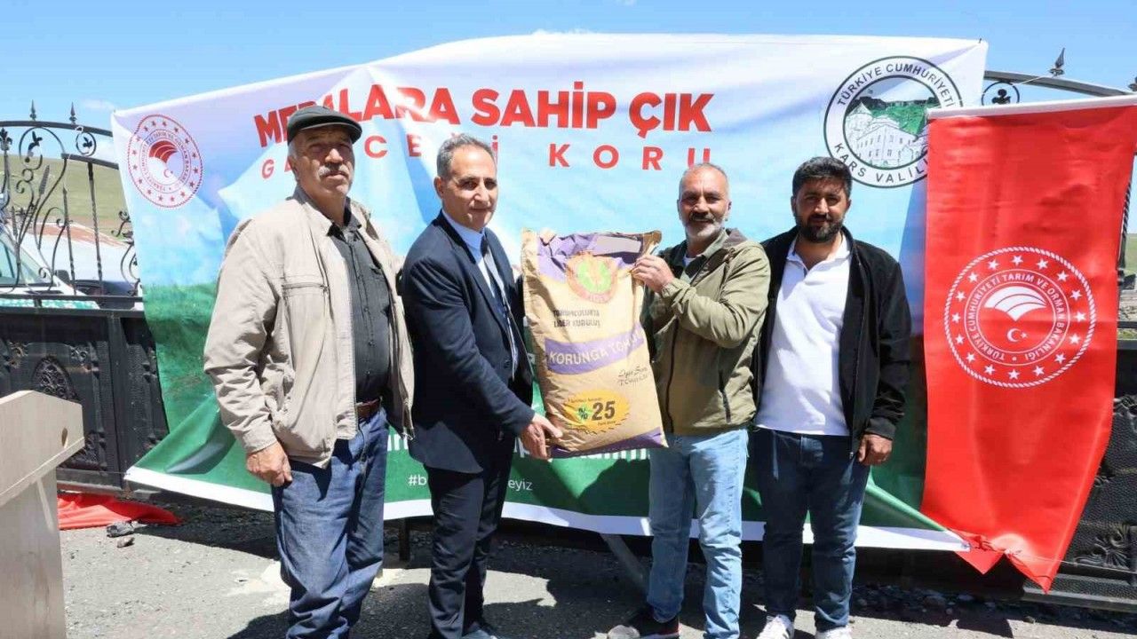 Kars Meralarını Geliştirme Projesi kapsamında, Sarıkamış ilçesine bağlı Yayıklı köyünde gerçekleştirilen programla yüzde 100 hibeli 60 ton korunga tohumu toprakla buluşturulmak üzere çiftçilere verildi.