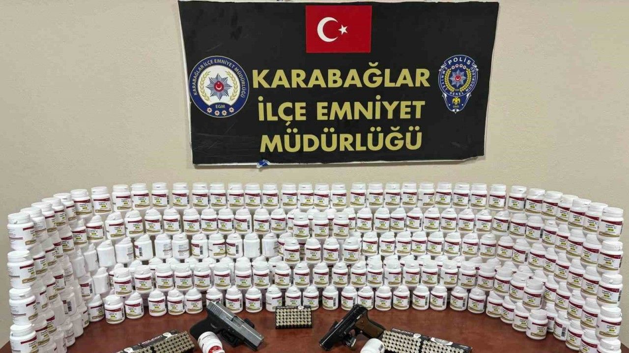 Karabağlar İlçe Emniyet Müdürlüğü Suç Önleme ve Soruşturma Büro Amirliği ekipleri, M.A.’nın (24) ilçede uyuşturucu madde ticareti yaptığını belirleyerek harekete geçti. Uyuşturucu madde kullanımı ve ticaretinin yanı sıra hırsızlıktan da suç kaydı olduğu belirlenen M.A., kısa sürede yakalanırken, sattığı uyuşturucu maddelerin bir dükkanda muhafaza edildiği belirlendi. Adreste yapılan aramada, 13 bin 776 adet uyuşturucu nitelikli sentetik hap, bir miktar esrar maddesi, 1 hassas terazi ile 2 ruhsatsız tabanca ve 500 fişek ele geçirildi.