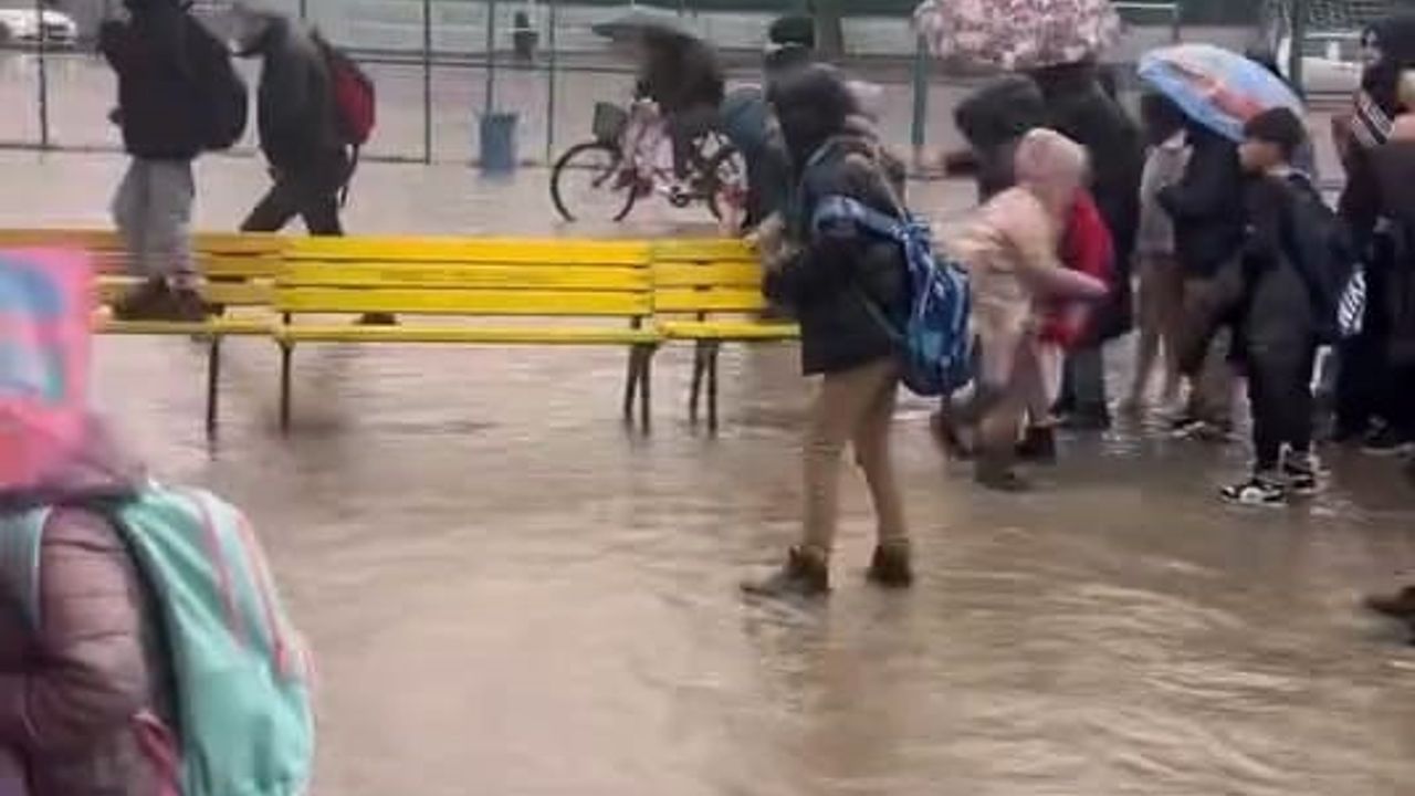 Bursa'nın İnegöl ilçesinde sağanak yağış hayatı zorlaştırdı. Olay Mahmudiye Mahallesi'nde eğitim öğretime devam eden Müşerref Muzaffer Samda İlkokulu bahçesinde meydana geldi. Yoğun yağış nedeniyle okulun bahçesi göle döndü. Veliler öğrencileri okuldan çıkarmak için bankları sıralayıp geçirdiler