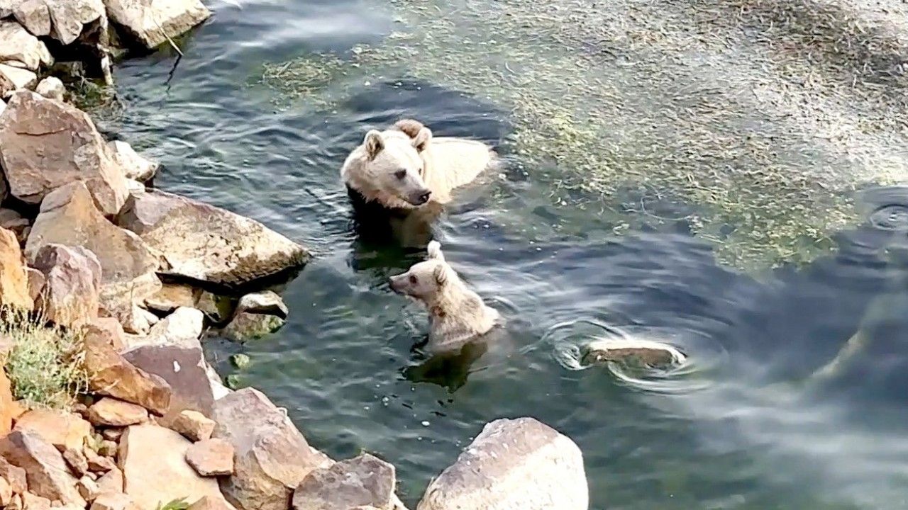 Bitlis’in Ahlat, Güroymak ve Tatvan ilçe sınırları içinde bulunan Nemrut Kalderası’nda yaşayan ayılar sıcaktan bunalınca kendilerini Nemrut’un serin sularına attı.