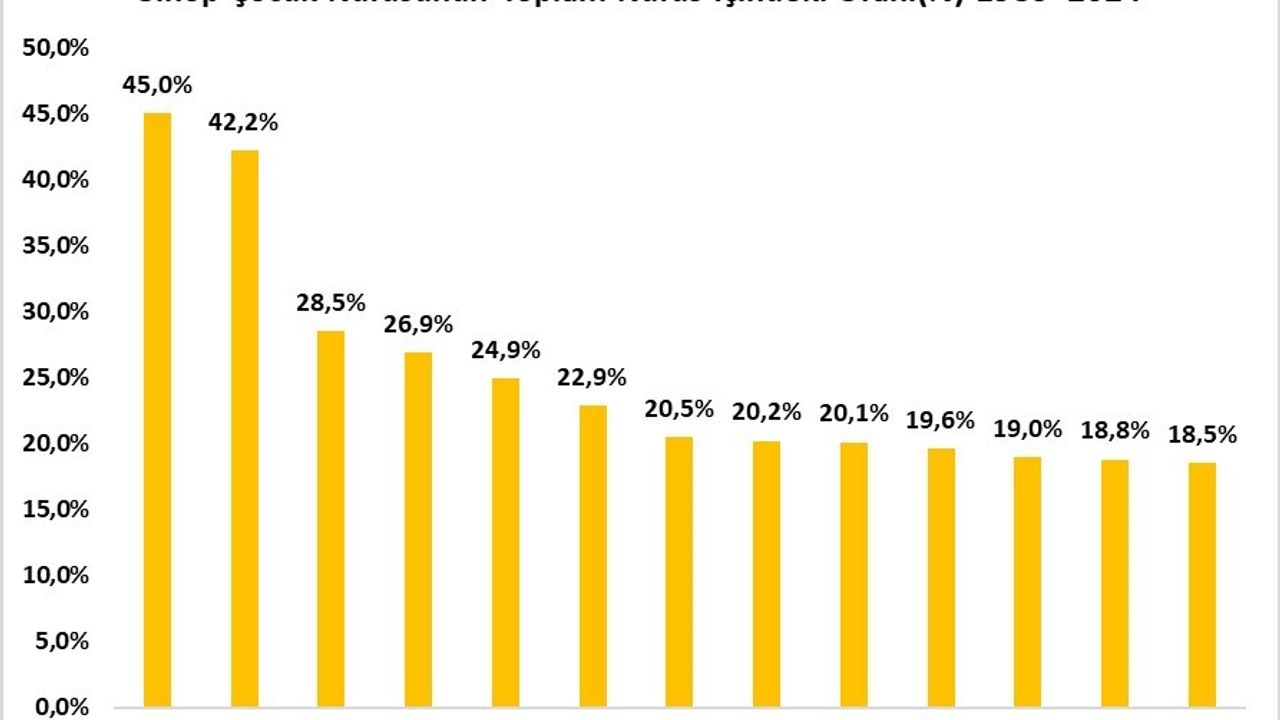 Evlenme istatistiklerine göre 16-17 yaş grubunda olan kız çocuklarındaki resmi evlenmelerin toplam resmi evlenmeler içindeki oranı 2023 yılında yüzde 2,4 iken 2024 yılında bu oran yüzde 1,5 oldu.