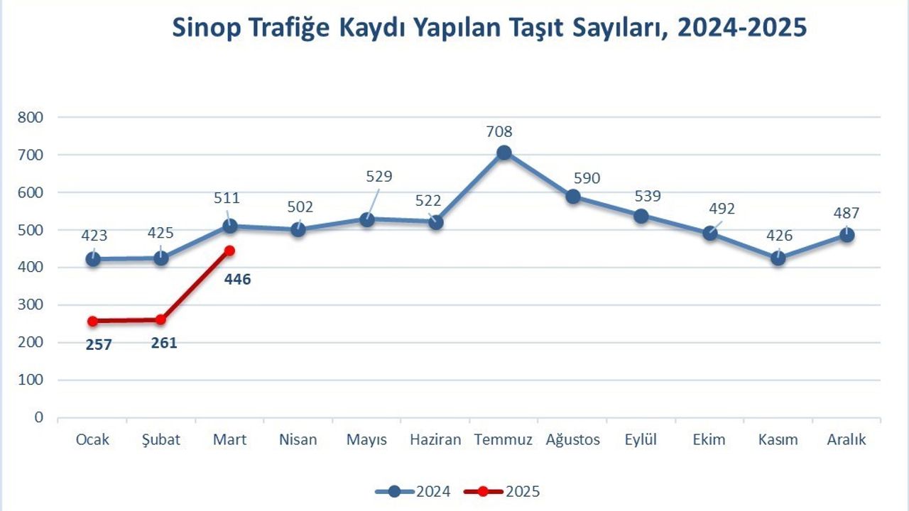 Sinop’ta Mart ayında 446 adet taşıtın trafiğe kaydı yapıldı. Trafiğe kaydı yapılan taşıt sayısı geçen aya göre 185 adet arttı. Sinop’ta Mart ayında 25 farklı otomobil markasından 123 adet aracın trafiğe kaydı yapıldı. Mart ayında bin 568 adet taşıtın da devri yapıldı.
