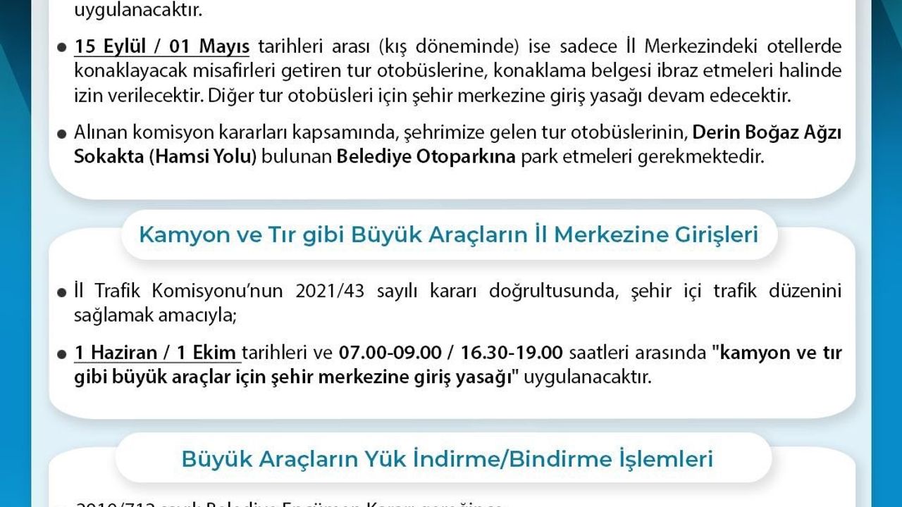 Alınan karara göre, 15 Eylül-1 Mayıs tarihleri arasındaki kış döneminde ise yalnızca şehir merkezindeki otellerde konaklayacak misafirleri taşıyan tur otobüsleri, konaklama belgesi ibraz etmeleri şartıyla şehir merkezine giriş yapabilecek. Diğer tur otobüsleri için yasak yıl boyu devam edecek. Komisyon kararları kapsamında şehre gelen tur otobüslerinin, Derin Boğaz Ağzı Sokak (Hamsi Yolu) üzerinde bulunan Belediye Otoparkı’na park etmeleri zorunlu olacak.
