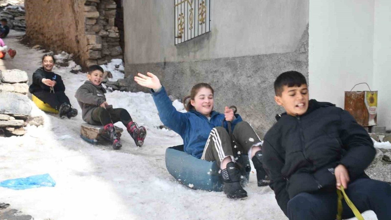 Şırnak’ın Uludere ilçesinde çocuklar, kış aylarında kızak ve bidonlarla kaymanın keyfini yaşıyor.