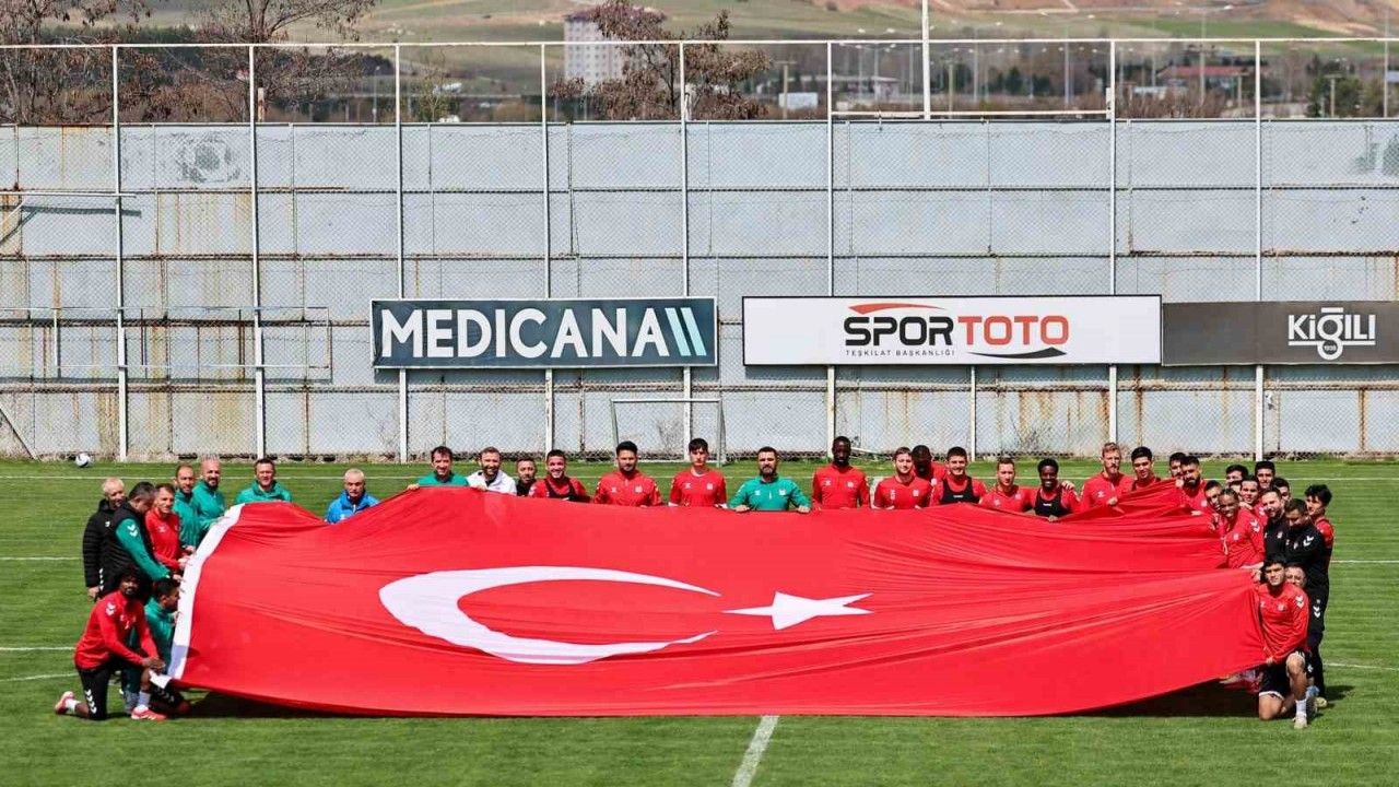 Kırmızı-beyazlı ekipte futbolcular ve teknik heyet, 23 Nisan Ulusal Egemenlik ve Çocuk Bayramı dolayısıyla antrenmanda saha ortasında dev Türk bayrağı açarak poz verdi.