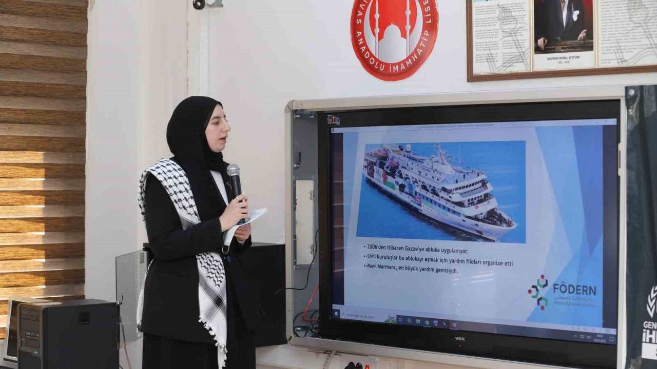 Filistinli öğrenciler programda Filistin’in işgali, bugüne kadar yaşananlar, İsrail’in işlediği savaş suçları, insanlık dışı saldırılar, Gazze’deki abluka ve Filistin halkının yaşadığı zulmü kendi yaşadıkları olaylardan kesitlerle lise öğrencilerine anlattı.