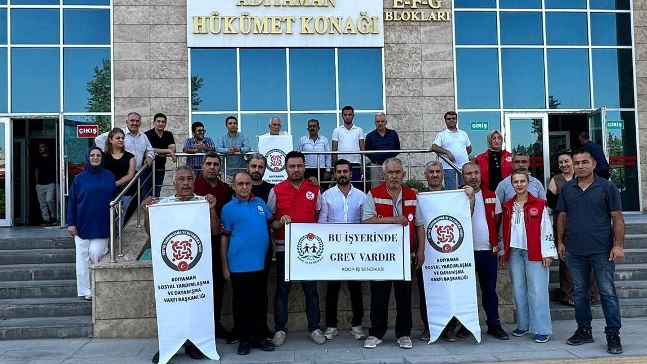 Adıyaman’da bir araya gelen Koop-İş üyeleri, sosyal yardımlaşma vakfı işçilerinin kamu protokolü kapsamına alınmaması nedeniyle greve çıktı.