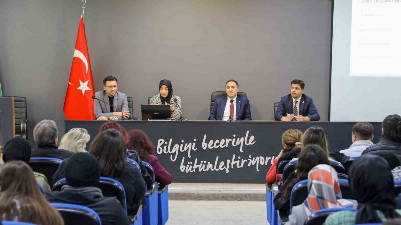 Sakarya Uygulamalı Bilimler Üniversitesi (SUBÜ) Sağlık Kültür ve Spor Daire Başkanlığı, ‘Üniversite Öğrenci Toplulukları İş Birliği ve Destek Programı (ÜNİDES) 4’üncü Dönem Başvuru Hazırlıkları Toplantısı’ düzenledi. Rektörlük Konferans Salonu’ndaki toplantı; Rektör Yardımcısı Prof. Dr. Oğuz Türkay, Sağlık Kültür ve Spor Daire Başkanı Dr. Orhan Yılmaz, Öğretim Görevlisi Yavuz Yıldırım, Sakarya Gençlik Merkezi Genç Ofis Sorumlusu Habibe Özge Geyik ile 79 öğrenci topluluğunun akademik danışmanları ve öğrenci temsilcilerinin katılımıyla gerçekleşti. Toplantıda ÜNİDES programı ve başvuru süreçleri hakkında bilgilendirme yapıldı. Gençlik ve Spor Bakanlığı’nın yürüttüğü ÜNİDES, gençlerin yoğun olduğu alanlarda onların desteklenmesini ve gençlik merkezlerine bağlı genç ofislerin etkin ve verimli bir şekilde kullanılmasını sağlamayı amaçlıyor.