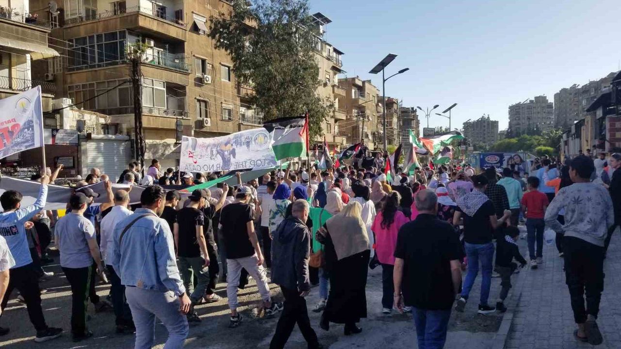Suriye’nin başkenti Şam’da düzenlenen Filistin’e destek gösterisinde yüzlerce Suriyeli, "Gazze kalbimizde" sloganları attı.